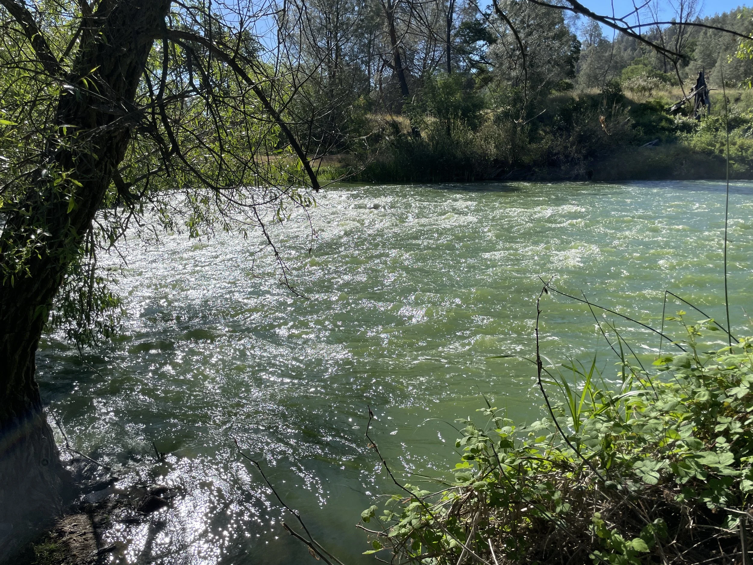 A short but steep climb brings me to the top of the ridge, offering a lovely view of a sage-green Cache Creek. The water in mid-May is stubbornly high, far too high to attempt crossing. When I saw the creek from this same spot in December, its flow was a mild burble.