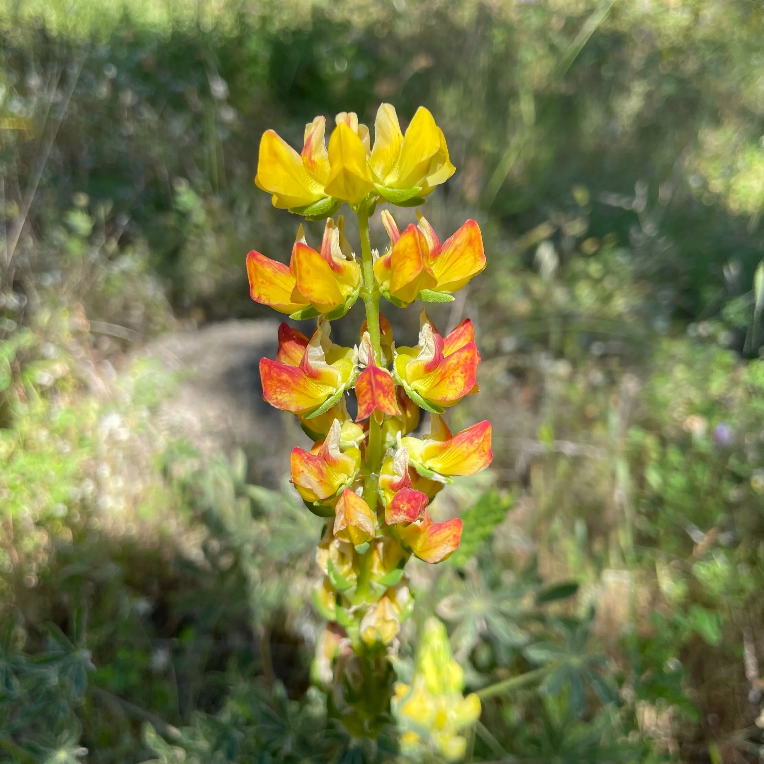 Silver lupine grows alongside the trail here, though it’s past its prime in May. The white-petaled variety is tinged with red as it fades and prepares to reseed for next season.