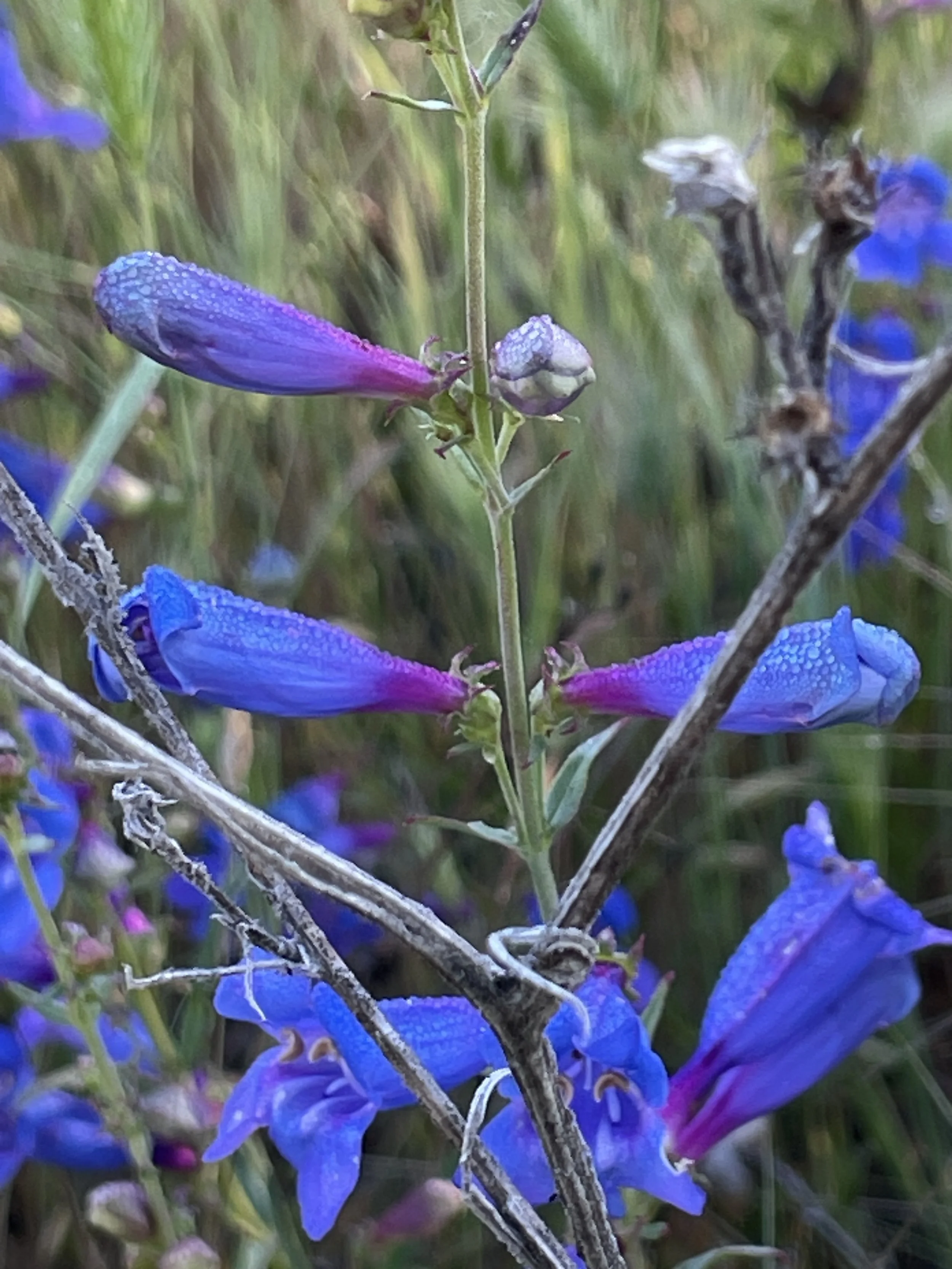 Foothill penstemon, a California endemic, can be found in May along this trail, after the poppies and lupine have mostly phased out. This variety of penstemon is a spectacular flower. In the morning, the petals catch capture the dew, imparting a luminescent quality to the flower as it shades from a deep violet to a cool blue.
