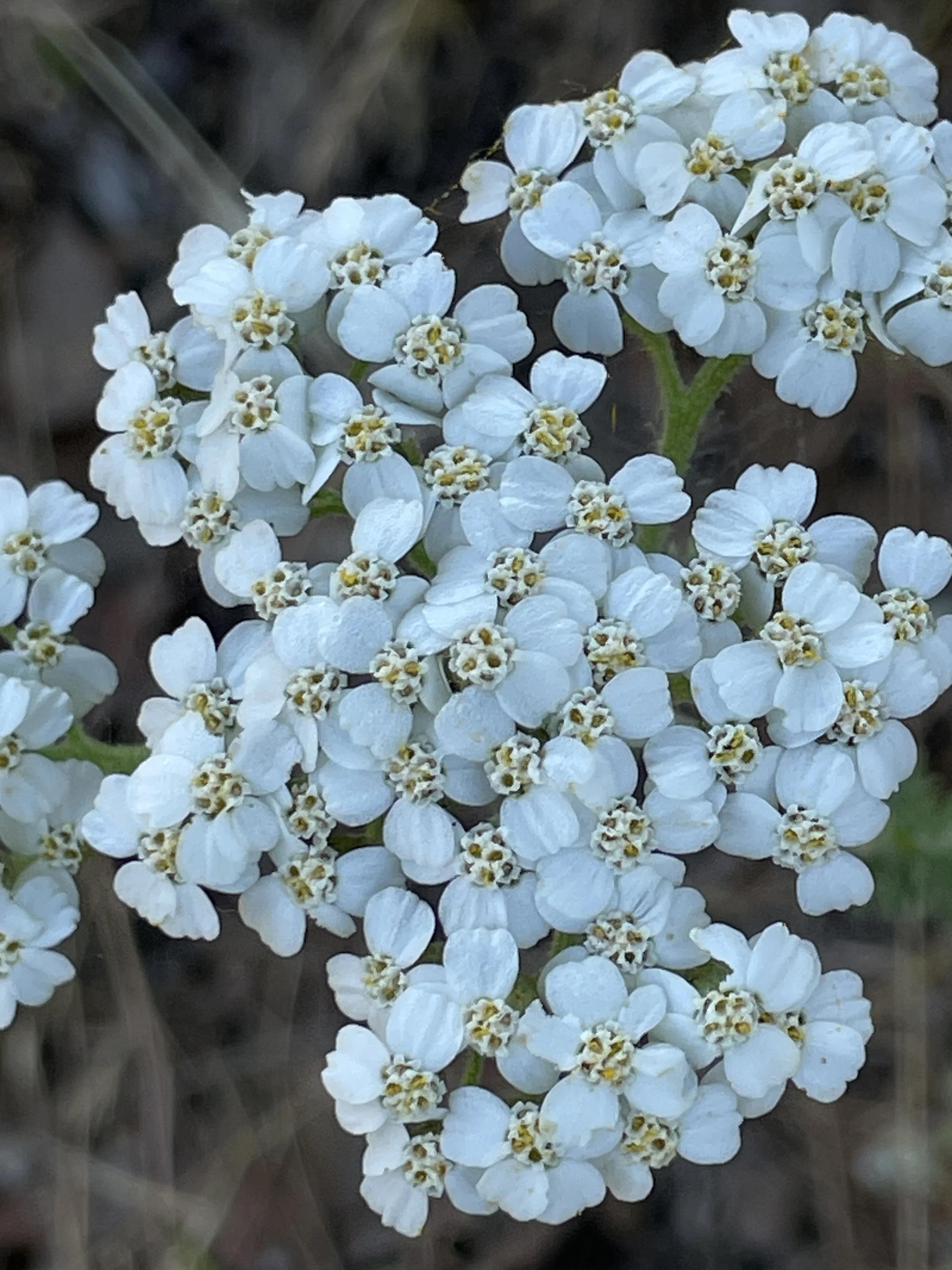 Yarrow, a more subtle wildflower that stands upright with denise white blossoms, blooms along the same slopes as the penstemon. At waist height, its stem is decorated with fine, fernlike leaves, with a bushy white top. Yarrow serves as a great pollinator plant, and research has also shown that birds who use yarrow to line their nests enjoy some protection from parasites, as the plant itself is mildly toxic. People should never eat the plant.