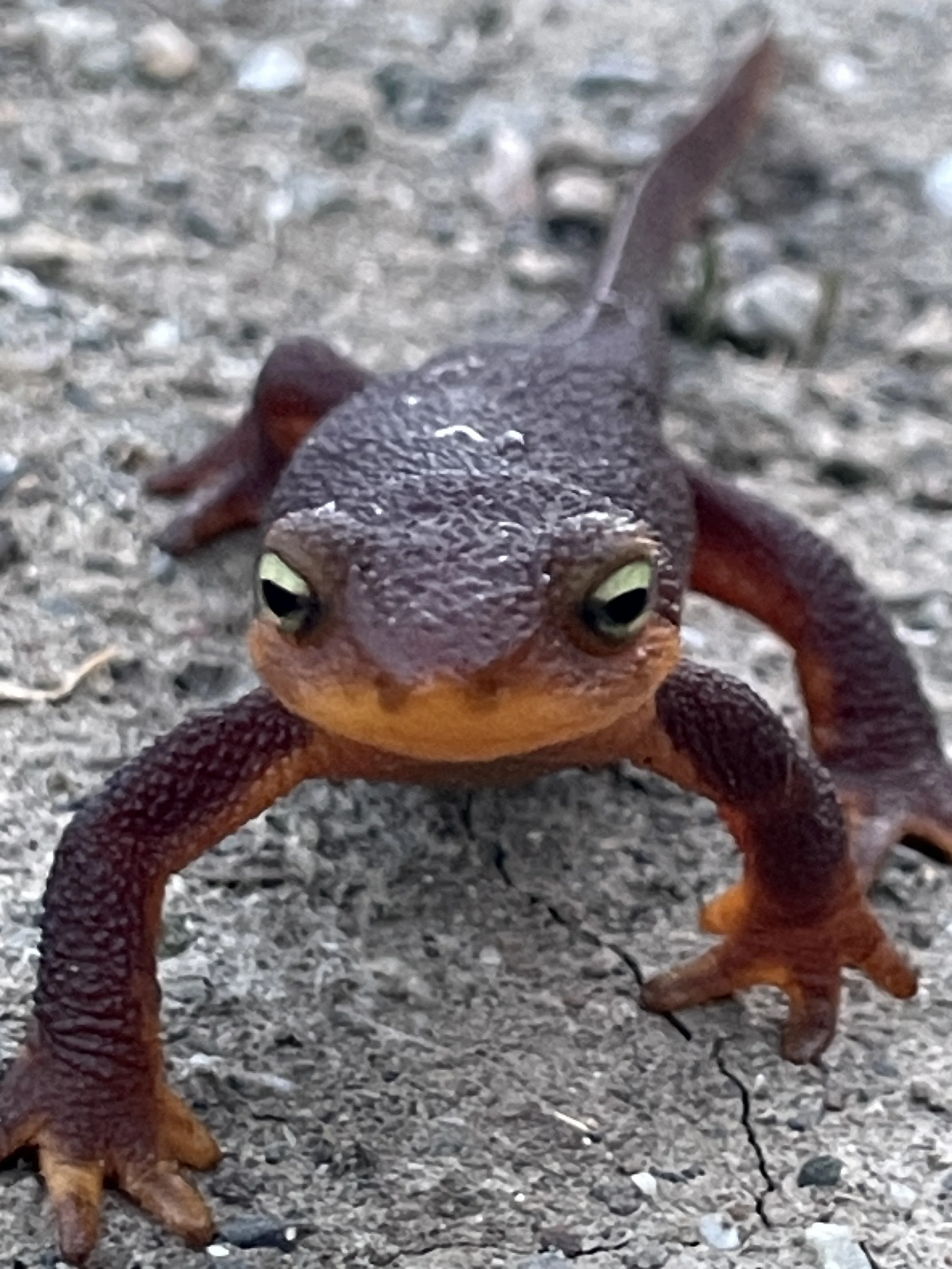 Newts found in the fall are in their terrestrial form as they initiate its mating season and by returning to the pools where they were born. California newts look shockingly defenseless on trail, their proto-legs slowly conveying its body up the hillside. The toxins in their skin protect them from predators, granting easy passage to the newt on its slow uphill journey. I stop to look at one more closely, peering into its widely spaced eyes. The newts have amazing faces, with huge eyes that stick halfway out of their heads and a dimpled skeletal structure that produces a constant pseudo-smile.