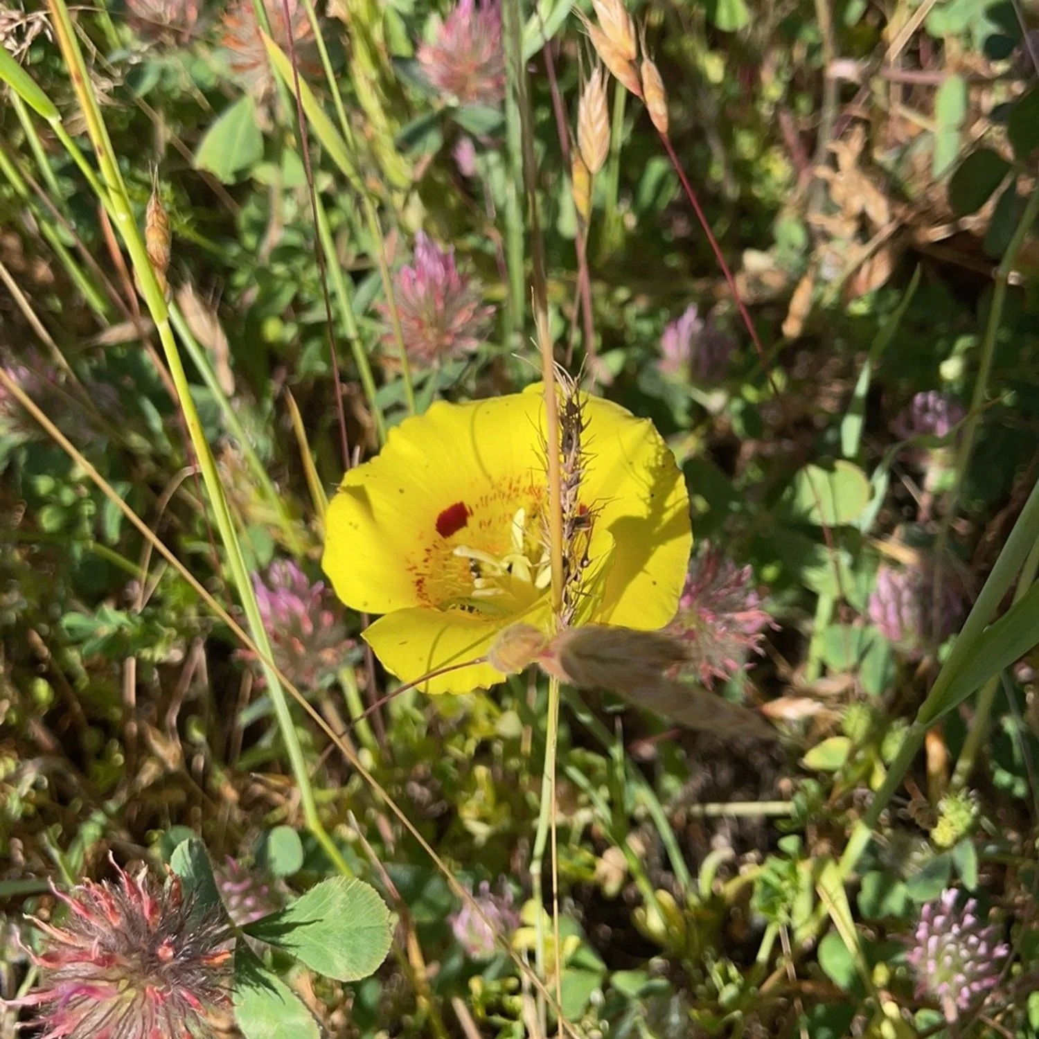 The trail drops straight down to Baton Flat. In the warmer months, star thistle and other invasive grasses may cover this section of trail. I’m surprised to find Yellow Mariposa Lily up here, a beautiful flower I’ve seen in the Sierra Nevada but never in the Coastal Range. They feature beautiful layered petals similar to a poppy, but shaded a buttery yellow with speckles of brown in the interior folds. They grow further apart from one another than the more fraternal poppy, which tends to grow in bunches and clumps.